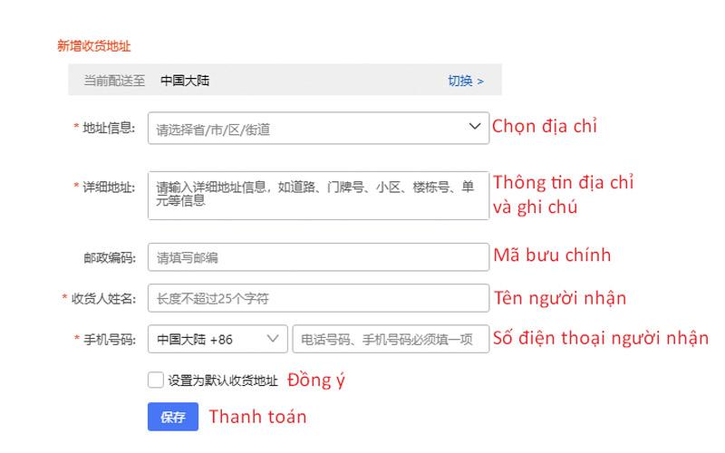 Điền thông tin vận chuyển để nhận hàng tại Trung Quốc