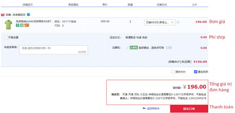 Giao diện thanh toán hộ 1 lệnh chứa 1 đơn hàng (taobao, tmall)