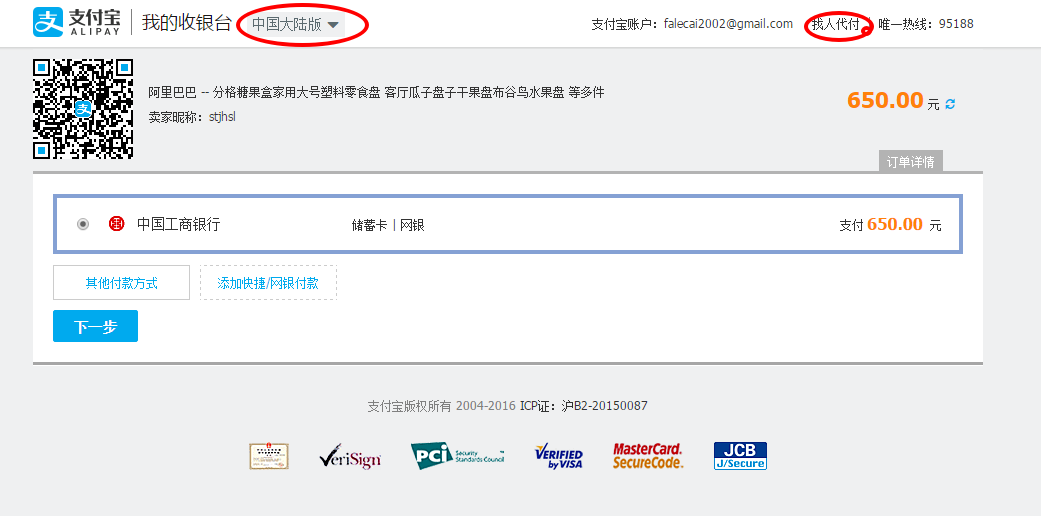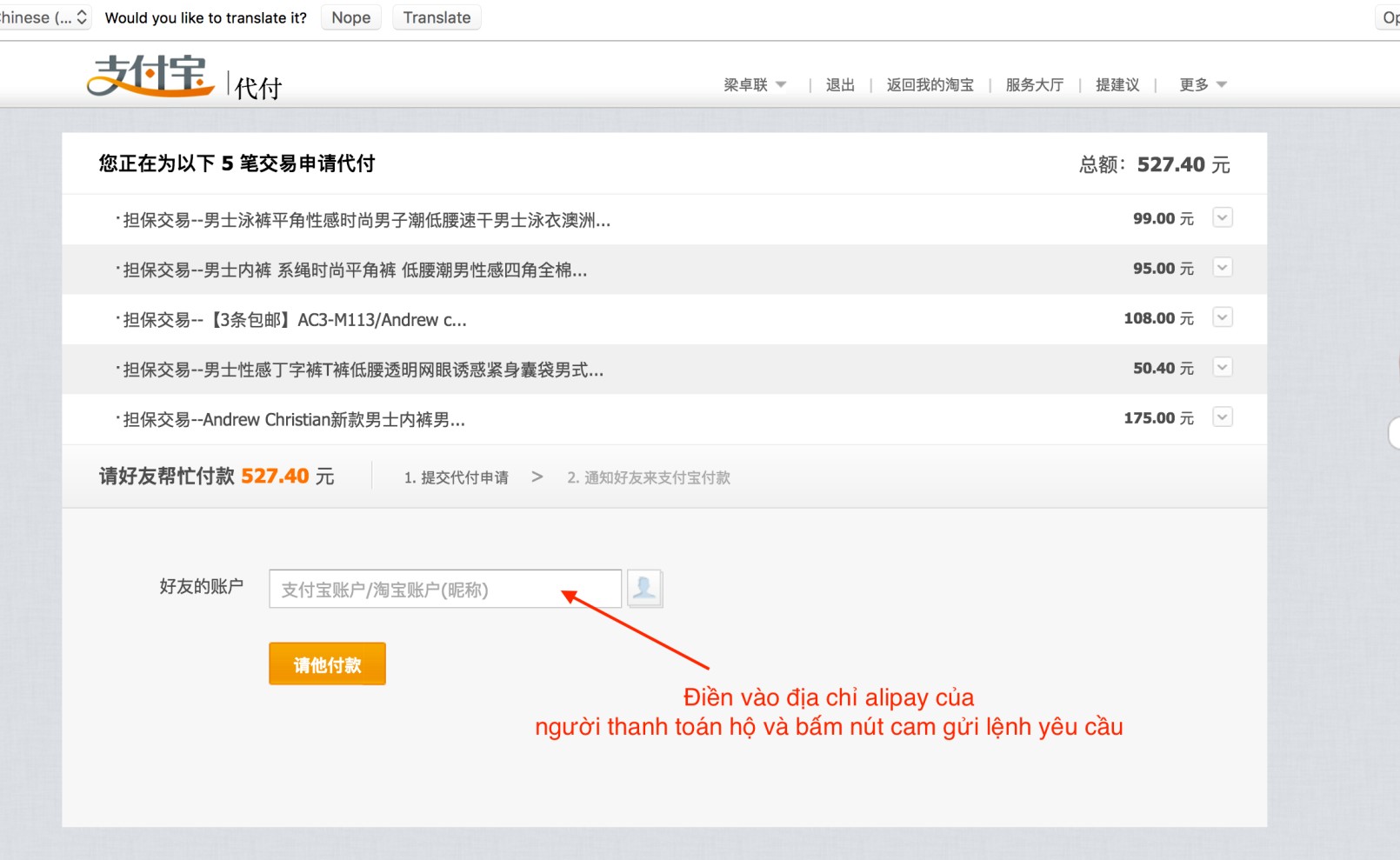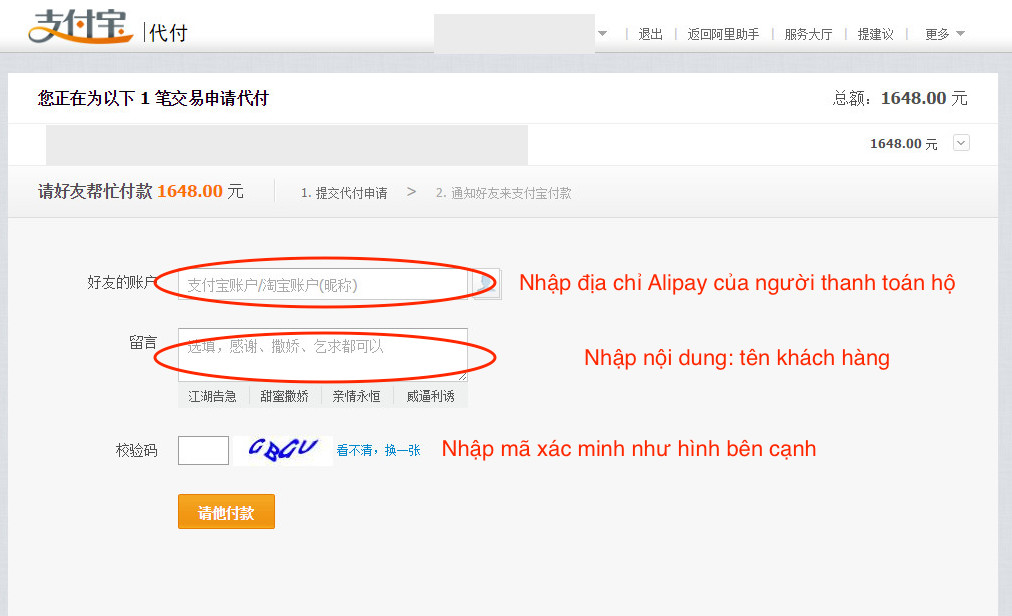 Cửa sổ sẽ chuyển hướng đến tài khoản Alipay. Lúc này bạn cần nhập thông tin người thanh toán hộ. Thông tin ở đây có thể là email hoặc số điện thoại của tài khoản thanh toán hộ